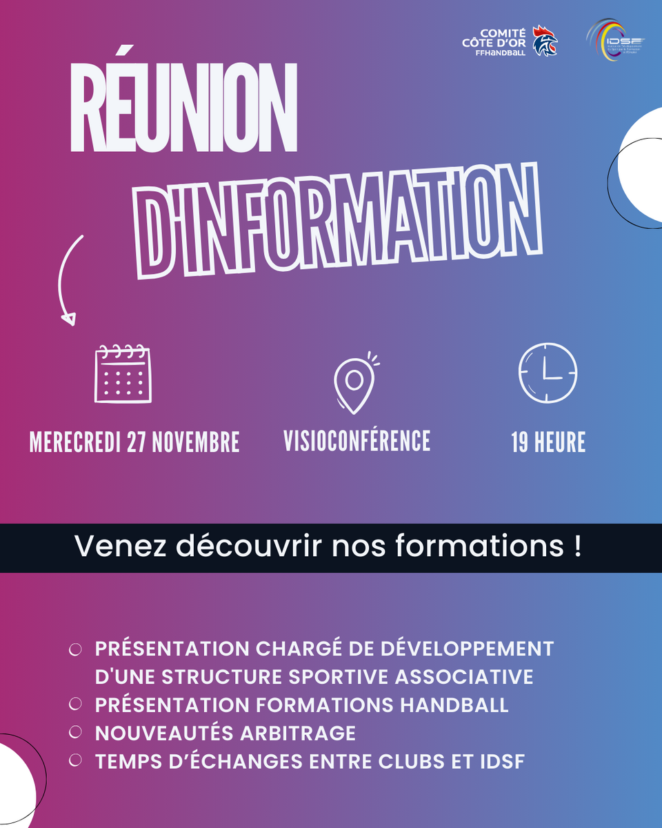 Le Comité et l'IDSF de la Ligue BFC sont heureux de vous inviter à participer à une REUNION D'INFORMATION sur